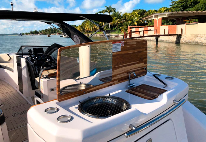 O banheiro possui uma pia com ducha higiênica, suporte para toalha, porta objetos, papeleira, espelho e iluminação em LED. O Paiol é ideal para guardar equipamentos como coletes, boias, cadeiras de praia e ainda é possível adaptá-lo para receber um forno micro-ondas. A embarcação possui um generoso espaço gourmet com pia, churrasqueira a carvão, quatro porta copos e uma plataforma de popa superampla sem falar do Open Deck.