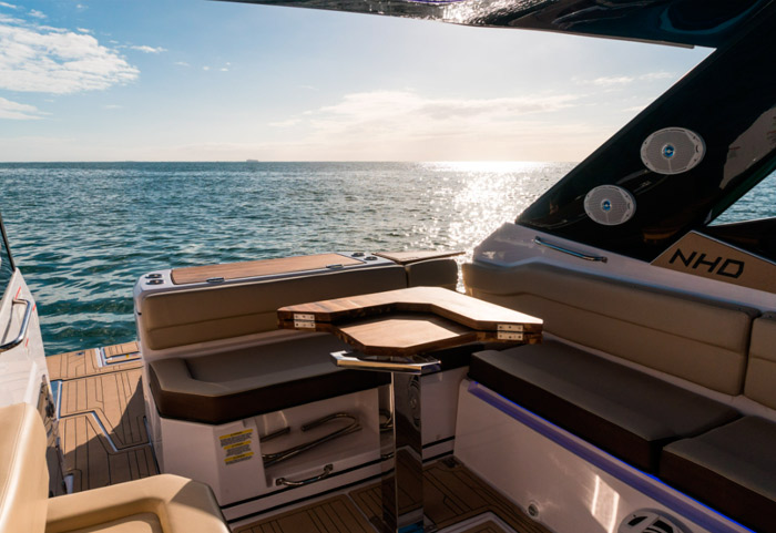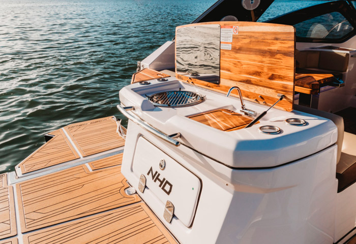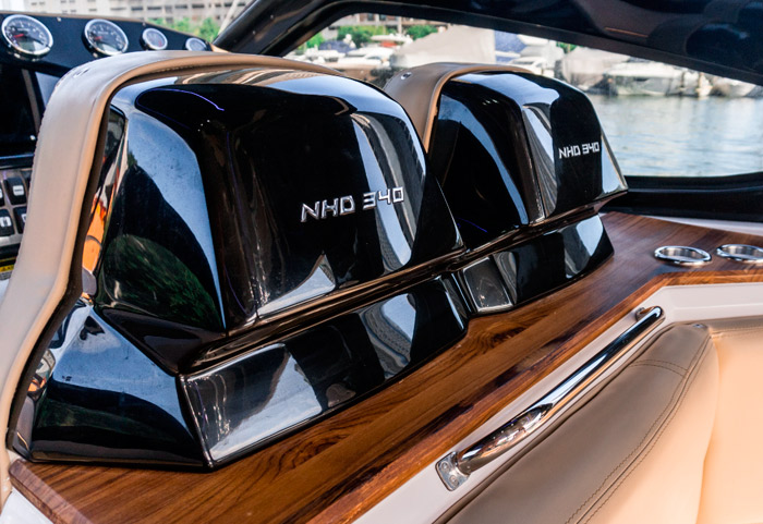 A NHD340 conta com uma proa aberta, cabine com cama de proa e meia nau, cockpit amplo e espaçoso para uma excelente interação entre os passageiros, nichos para armazenamento de equipamentos, mantimentos e bebidas, plataforma de popa com Double Open Deck e um espaço gourmet de série.