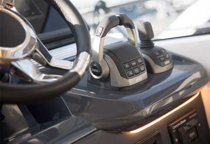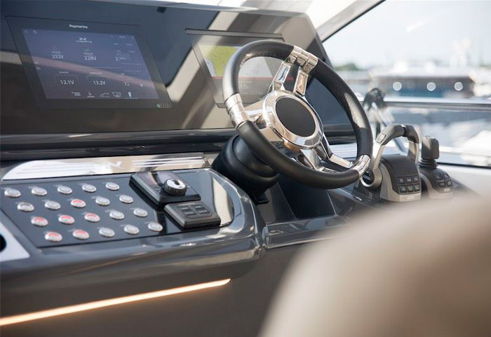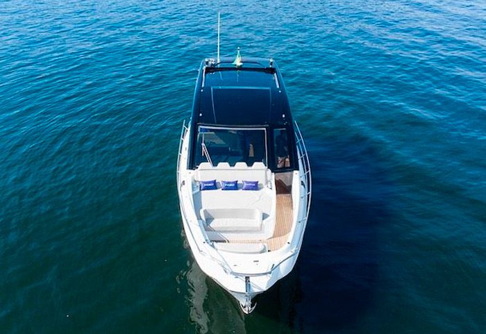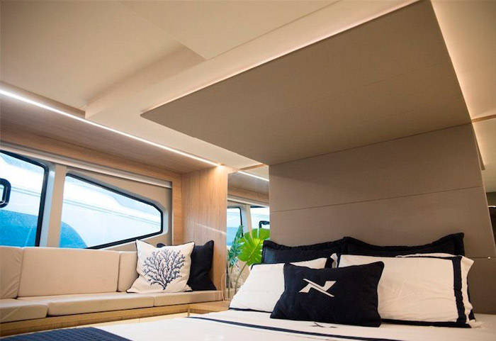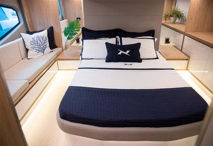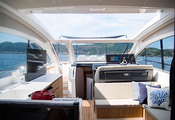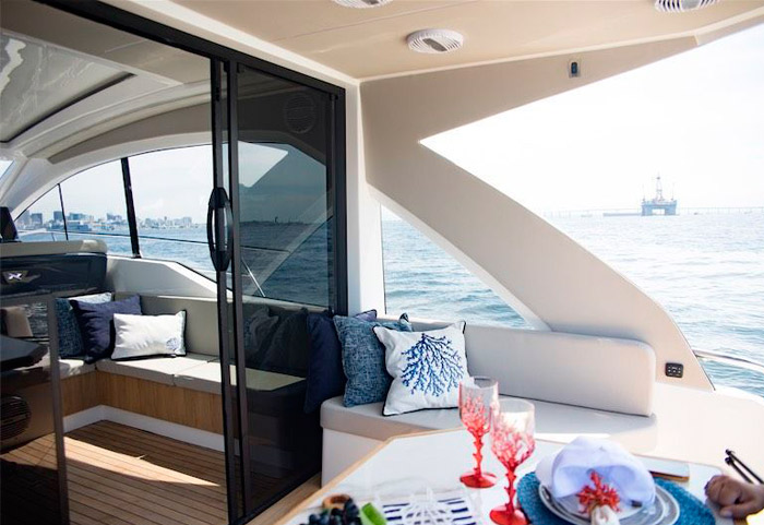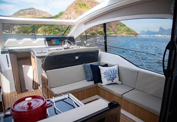 O acabamento premium está presente tanto nos estofados em couro natural, quanto nos revestimentos do teto e também da lateral da embarcação. O piso e a mesa são de teka natural, sem contar o mármore italiano na mesa. Todos os inox presentes são exclusivos e robustos, desde os que estão presentes na cozinha, até o chuveiro na popa, ou os porta-copos desenhados exclusivamente para esse barco. As cores claras do acabamento geral da embarcação, traz classe e aconchego para o barco.