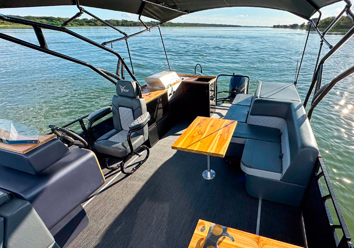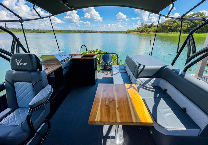 Com comprimento de 7,5 m e largura de 3,0m , o VCAT Aurora 750 NG tem capacidade de transportar 18 pessoas com muito conforto e segurança. Sua área gourmet personalizável, inclui pia com espaço gourmet integrado, geleira e duas opções de churrasqueira como itens de série.